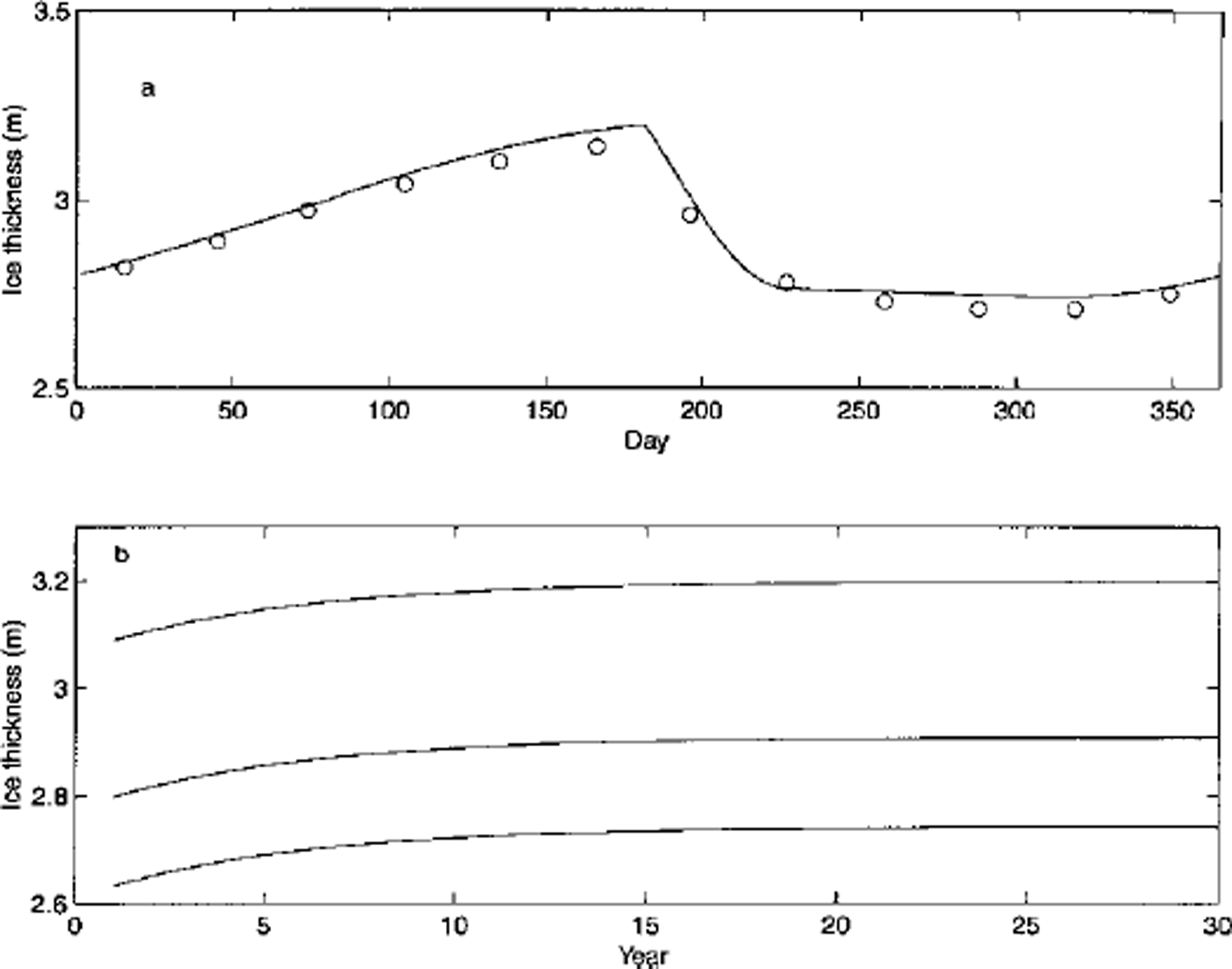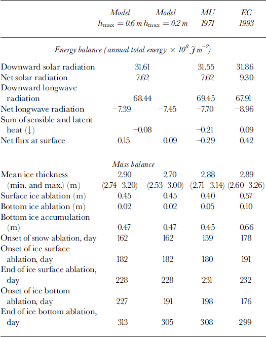 We used 2.7 m of ice with a linear temperature profile as our initial condition. By taking advantage of our implicit scheme we run the model with a time-step of 24 h. After 20−30 years of integration depending on a vertical resolution, the equilibrium annual cycle was reached. Figure 4 shows the equilibrium annual cycle and the time series of annual mean, minimum and maximum thickness over the integration period for the case with the maximum snow and ice thickness of 0.3 and 0.6 m, respectively. Table 1 summarizes the energy and mass balance of the equilibrium annual cycles from the control run and its counterpart in MU 71 and EC93. With the maximum ice-layer thickness set at 0.6 m, equivalent to 5−6 layers, our model predicts a similar equilibrium annual cycle to that of the MU model (i.e. within ±6 cm for the mean, minimum and maximum ice thickness). With this resolution the monthly mean thickness is in close agreement with that of MU71 (shown in Fig. 4a as circles). As the vertical resolution of our model was increased to the maximum layer thickness of 0.2 m, equivalent to 13−15 layers, the mean equilibrium thickness dropped from 2.90 m to 2.70 m, with similar decreases found in both the minimum and maximum thickness. By contrast, the amount of surface and bottom ablation and bottom accumulation was relatively unchanged between two cases (i.e. the maximum difference was <1 cm). It varies across different models, however: for example, our model predicted a net bottom accumulation of 0.45 m, whereas the MU and EC models gave 0.4 and 0.56 m, respectively. These differences are due in large part to a varying degree of complexity in surface albedo parameterizations across the models (EC93), but also reflect differences that exist in the forcing conditions (i.e. Table 1 shows that the net heat flux at the surface varies considerably: −0.29 M J m−2 in MU71 to 0.42 MJ m−2 in EC93, and ours in between). It was found that the difference in the net heat flux at the surface between MU71 and our model had seasonal dependence as seen in Figure 3d. As the amount of net shortwave radiation is almost identical in both models (Fig. 3c), this difference in the net surface heat flux must be associated with the difference in the surface temperatures, perhaps an indication of the effect of different numerical schemes. Despite these differences, our model seems to simulate the equilibrium annual cycle in a reasonably close agreement with previous studies under similar forcing conditions.