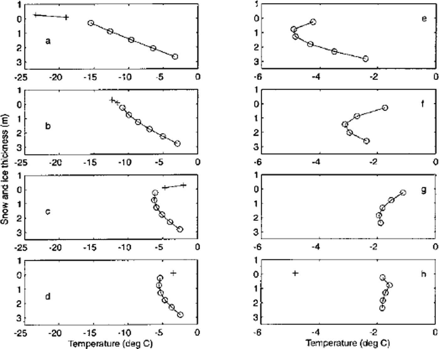 Fig. 5. A time series of temperature profiles for snow (plus) and ice (circle) at (a) day 105, (b) day 135, (c) day 165, (d) day 175, (e) day 182, (f) day 196, (g) day 230 and (h) day 244.