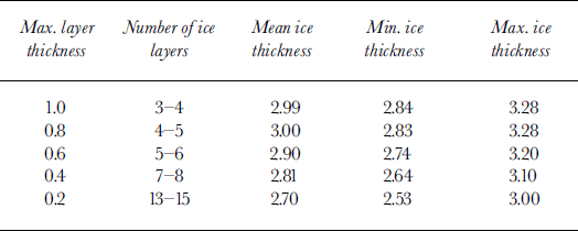 We also evaluated the effect of vertical resolution by changing the maximum layer thickness from 1.0 m to 0.2 m with an increment of 0.2 m, which is equivalent to changing the number of layers from 3 to 13 layers (see Table 2). The results show the variation in the equilibrium mean thickness, ranging from 2.70 m with a maximum layer thickness of 0.2 m, to 2.99 m with a maximum layer thickness of 1.0 m. This contrasts with the results of Reference SemtnerSemtner’s (1976) experiment, in which he found a converging yet increasing trend in the equilibrium thickness with an increasing number of layers.