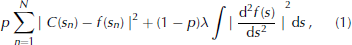 The first term in Equation (1) is a standard measure of squared distances while the second term is a roughness measure. When p = 1, the second term of Equation (1) disappears so the spline is bound only by the condition of minimizing the distance between the spline curve and the original outline points. When applied to sets of closed outline points, this corresponds to a ‘natural’ cubic spline because the spline is forced to pass through all of the original points (Reference de Boorde Boor, 1978). When p = 0, the first term of Equation (1) disappears so the spline is bound only by the condition of minimizing the roughness measure term. Since the second derivative of the spline function is effectively a measure of the curvature, minimizing the second term of Equation (1) requires that the curvature of the spline outline be minimized at all points on the curve. The result is therefore simply a linear least-squares fit, as a straight line effectively has a curvature of 0.