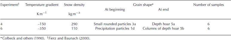 Reference Fierz and BaunachFierz and Baunach (2000) describe well-defined temperature-gradient metamorphism experiments performed in a cold laboratory. Here we use the pictures taken during two of these experiments that lasted 3 days each. Table 1 gives an overview of both experiments and samples. Each sample contained 100–270 individual snow grains. We use these well-characterized samples to look at the time evolution of shape descriptors.