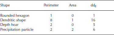 where P is grain perimeter and A is grain area. This parameter aims to distinguish between new, fragmented and decomposing snow grains (dendritic grains) and older, fully decomposed snow grains (non-dendritic grains). The principle of this parameter is that dendritic grains, with their characteristic branches and dendrites, tend to have a large perimeter and a relatively small area. Non-dendritic grains, however, tend to have much simpler shapes with a larger area and smaller perimeter. A perfect circle has a dendricity of 1, whereas a new snow grain yields values of up to 20 or more. For a complete sample containing small grains, Reference Lesaffre, Pougatch and MartinLesaffre and others (1998) found this parameter to be more effective as a sum over all grain perimeters and areas, i.e.