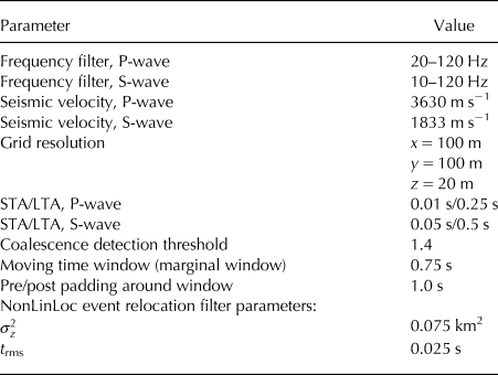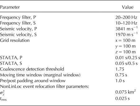 The phase arrivals of all the detected events are manually picked and located using NonLinLoc (Lomax and Virieux, Reference Lomax and Virieux2000), as with the QuakeMigrate method. The catalogue of located events are then filtered using the $\sigma _{z}^{2}$ values calculated by NonLinLoc.