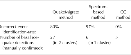 Table 3. Table summarising comparative performance metrics of the QuakeMigrate and spectrum-based methods, as well as the cross-correlation (CC) method applied to events detected via the spectrum-based method. The incorrect-event-identification-rate is defined as the number of surface crevasse events incorrectly identified as basal icequakes, relative to the total number of detections of crevassing and basal icequakes