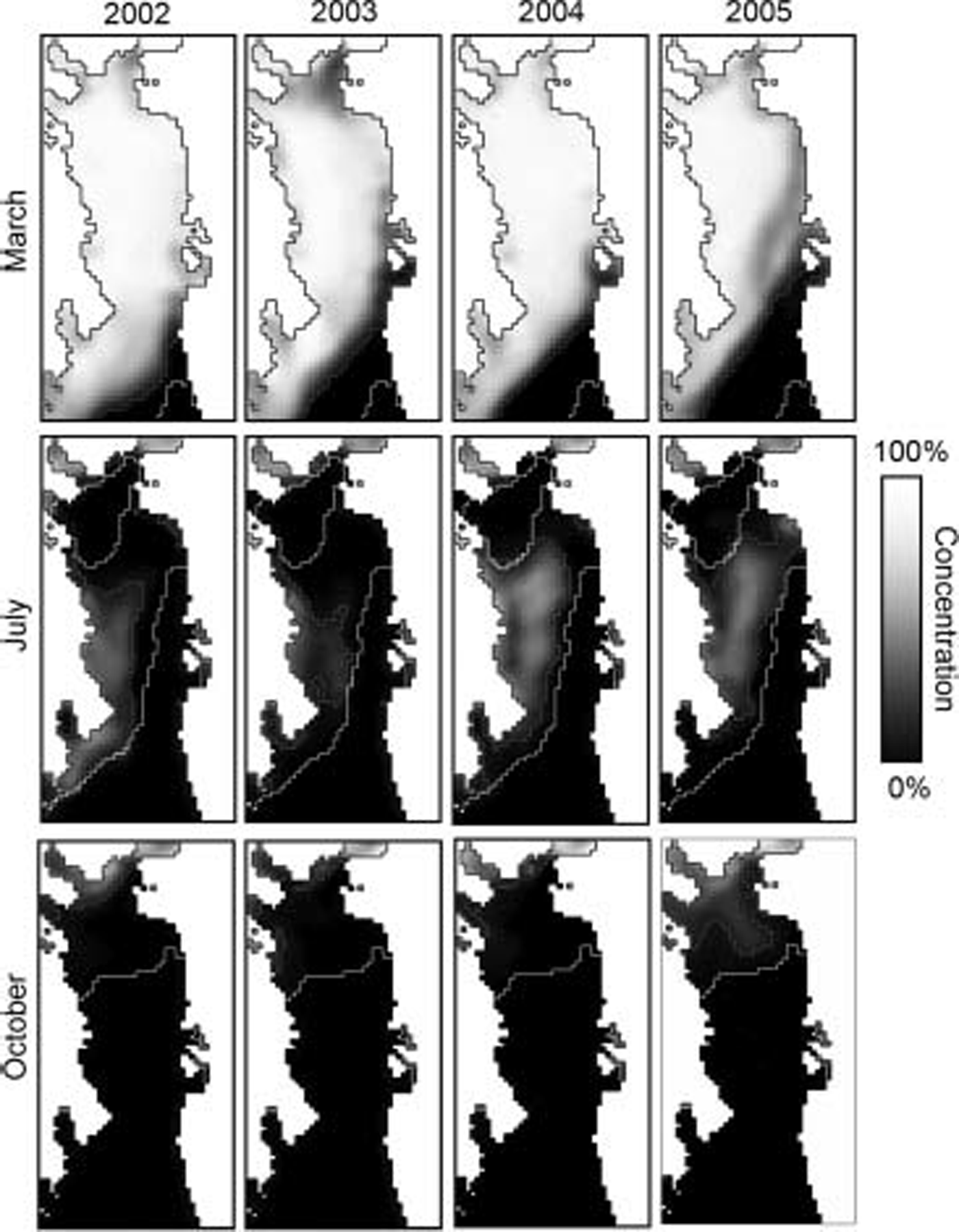 Sea-ice extent information was obtained from ice-concentration images derived from Satellite passive microwave data acquired by the nimbus 7 Scanning multichannel microwave radiometer (SMMR), which operated from 1979 to 1987, and the Special Sensor microwave/imager (SSM/i). the latter has operated on a Series of us defense meteorological Satellite program (DMSP) Satellites Since 1987. Sea-ice concentration and extent (based on a 15% concentration threshold) fields were derived from the imagery using the nasa-team algorithm (Reference Cavalieri, Gloersen and CampbellCavalieri and others, 1984) and were acquired from the national Snow and ice data center (NSIDC) in boulder, co, USA (d.j. cavalieri and others, http://nsidc.org/data/nsidc-0002.html). monthly imagery and time-series data are available online at the NSIDC through the Sea ice index (http://nsidc.org/data/seaice_index/). the fields are produced on a 25 km polar Stereographic grid. a 40×80 pixel (1000×2000 km) Subregion of baffin bay and Surrounding inlets was Selected for the analysis discussed here (fig. 1).