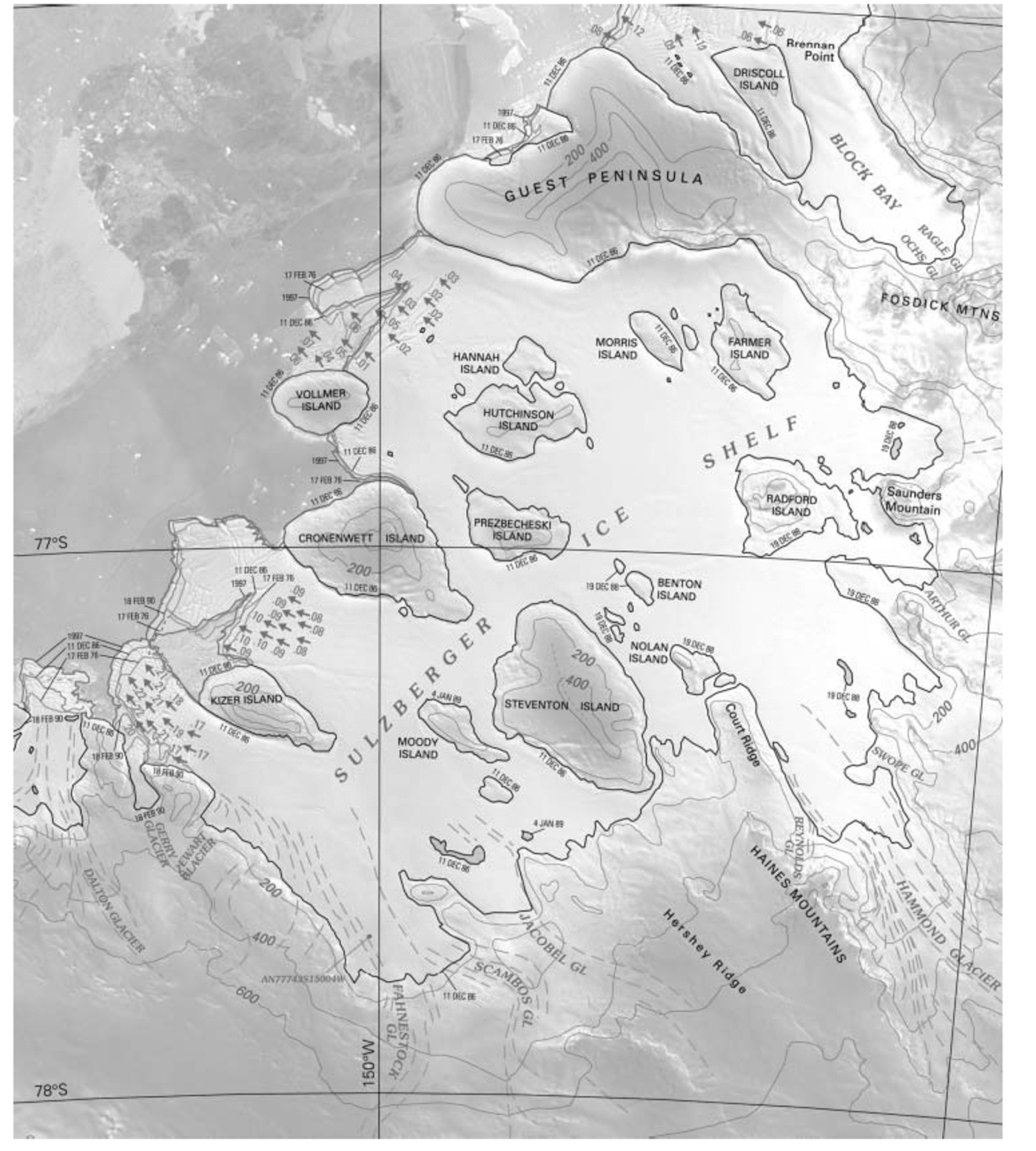 The Saunders Coast area map covers the part of Marie Byrd Land that extends from the eastern end of the Ross Ice Shelf (lat. 158.5˚W) to the western part of the Getz Ice Shelf (lat. 130˚W) and includes the Ruppert Coast and parts of the Shirase and Hobbs Coasts. The Saunders Coast area is composed of two glaciologically different areas. In the southwest corner of the map, Bindschadler, MacAyeal and Echelmeyer Ice Streams (former Ice Streams D, E and F respectively) and Kiel Glacier drain from the Shirase Coast into the massive, buttressing Ross Ice Shelf. The length of the grounding line along this part of the coastline is 800 km. The northern coastline is composed mainly of a constantly moving, floating ice front interspersed with a few small areas of fairly stable, grounded ice walls. The total coastline was digitally measured to be 1197 km long, of which only 458 km or 32% is ice wall. The dominant glaciological features on the map are Bindschadler Ice Stream (partially shown) and MacAyeal and Echelmeyer Ice Streams on the southwestern part of the map, and the Sulzberger, Nickerson and Getz Ice Shelves, and Land, Hull and DeVicq Glaciers on the northern coast. The Sulzberger Ice Shelf is the largest ice shelf on the map sheet, about 160 km long (east–west) and more than 100 km wide (north–south) (Fig. 2). It is easily recognizable by more than two dozen large and small ice rises distributed over its areal expanse between the Edward VII and Guest Peninsulas. Its area, including ice rises, is 15 721 km2. The next ice shelf to the east is the Nickerson Ice Shelf. It is separated from the Sulzberger Ice Shelf by the Guest Peninsula. According to the latest Antarctic gazetteer (Reference AlbertsAlberts, 1995), the Nickerson Ice Shelf is located north of Siemiatkowski Glacier and the western part of the Ruppert Coast and is about 60 km wide. There is no published measurement of the length. On the satellite images, it is clear that the ice shelf extends about 170 km from the eastern edge of the Guest Peninsula to Groves Island, making it the longest ice-shelf front on the map sheet. The area of the Nickerson Ice Shelf is 7207 km2, measured using the 1997 ice front. The Getz Ice Shelf extends 140 km on the eastern edge of the map and continues for another 450 km to the east within the adjacent Bakutis Coast area map. It is about 40 km wide on average. The area of the Getz Ice Shelf on this map is 5840 km2 as of 1997. Of the three major glaciers, Land and Hull Glaciers flow directly into the South Pacific quadrant of the Southern Ocean, and DeVicq Glacier flows through the Getz Ice Shelf. A total of 49 named and 3 unnamed glaciers and ice streams flow into the ice shelves or directly into the Southern Ocean; 4 other named glaciers are located in the interior mountain ranges.