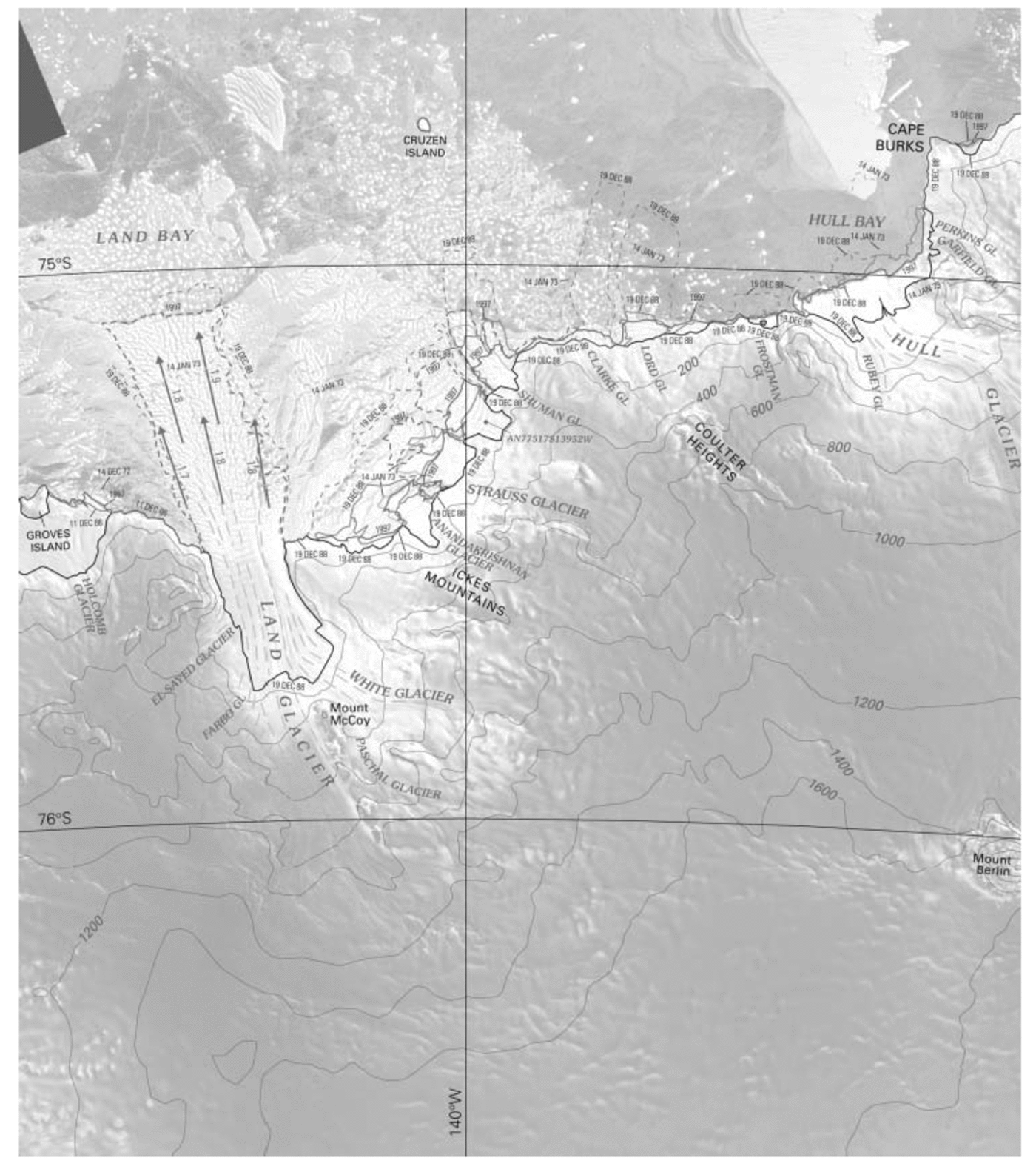 Fig. 3. Section of the USGS Geologic Investigations Map I-2600-G, Coastal Change and Glaciological Map of the Saunders Coast area, Antarctica, showing Land Glacier and smaller glaciers to the east. The multicolor map, reproduced here in black and white, shows the change in position of the ice front from the 1970s to 1997, and the location and amount of measured ice-surface velocities in km a–1. The grounding line has been interpreted from Landsat imagery. In this area there has been considerable calving of the glacier tongues, and much of the fast ice in the area disappeared, a possible indication of changing environmental conditions. The total loss in area and volume of Land Glacier by calving between 1973 and 1997 was roughly 1000 km2 and 200 km3. The original scale of the map is 1 : 1 000 000. The map section is approximately 195 km×225 km. The background image is the RADARSAT mosaic.