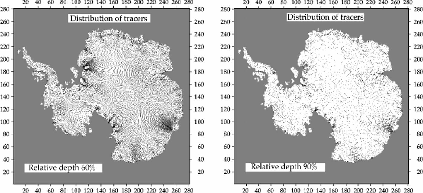 However, the largest differences occur in zones of large gradients and can therefore be explained by diffusive effects in the Eulerian scheme and, probably more importantly, the irregular distribution of tracers that results for deeper layers in the Lagrangian method. This is demonstrated in more detail in Figure 6, marking the positions where tracers have crossed a given depth layer during the course of the integration. At a relative depth of 60%, only half of the original tracers remain in the ice sheet, and the other half have migrated into the surrounding ice shelves or have been washed out in the ocean. At 90% depth, less than a quarter of the tracers remain, and they are distributed unevenly in space. It should, however, be noted that this problem will be less severe when tracers are launched at regular time intervals in time-depend-ent applications with changing climatic input and ice-sheet geometry.