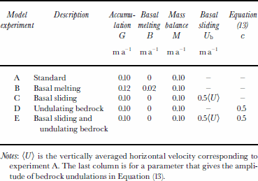 Notes: (U) is the vertically averaged horizontal velocity corresponding to experiment A. The last column is for a parameter that gives the amplitude of bedrock undulations in Equation (13).