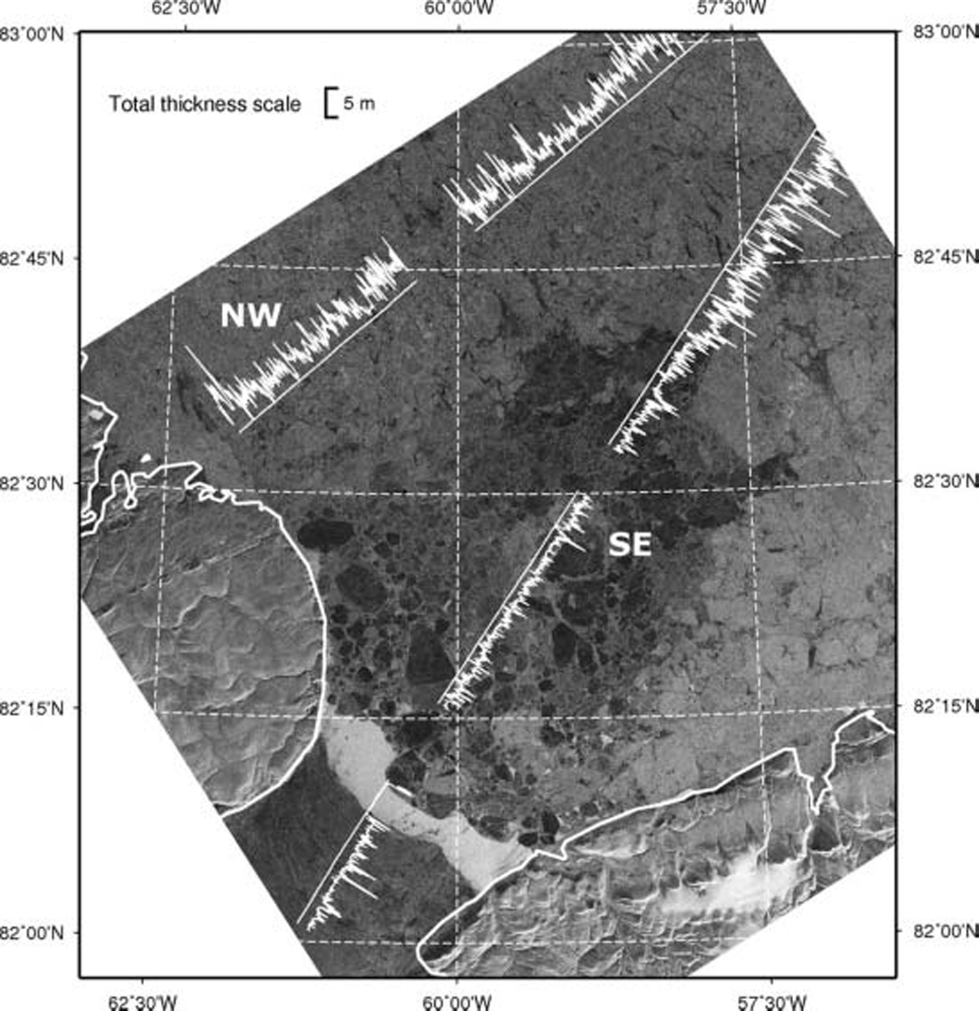 Fig. 3. Sar Satellite image of the Lincoln Sea and Nares Strait (courtesy ESA) with Superimposed ice-thickness data along the easternmost, triangular flight tracks in Figure 1, both acquired on 14 May 2005, at 17:47UTC and between 18:17 and 21:02 UTC, respectively. NW and SE mark the northwestern and Southeastern profiles compared in Figure 4. The SAR image has been obtained by the ESA Envisat Satellite at HH polarization with a pixel resolution of 12.5 m (IMP product). Dark pixels correspond to low radar backscatter.
