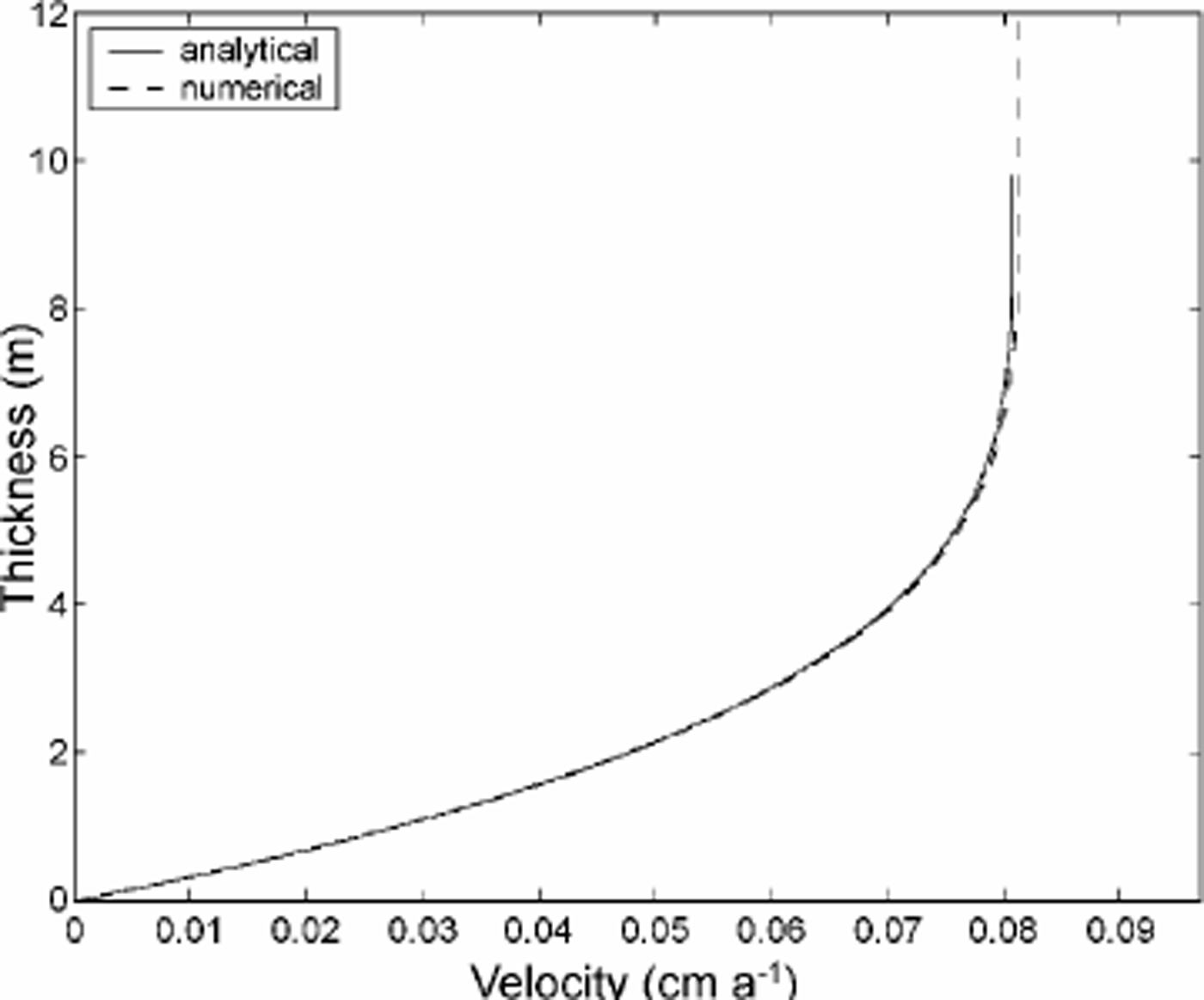 Free surfaces are adopted as boundaries for air, and the air density is set to 0. With these assumptions, an accurate solution for the ice flow is obtained. Figure 1 displays the velocity profile through an inclined parallel-sided slab surrounded by air as computed by the numerical model. This profile is compared to that derived from the analytical solution of the problem (Reference PatersonPaterson, 1994). The rheology of broken ice is also described by Equation (6). The viscosity is computed in Equation (7) with D = 1 – є. The densities of ice and of broken ice are assumed to be equal.