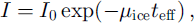where I0, Mice and teff are an incident X-ray intensity, the linear absorption coefficient of ice and the effective thickness of the sample, respectively. The density p is calculated according to the equation: