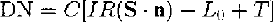 where DN is the usual "digital number" expressing image brightness, I is the incident solar radiance, R is the reilectivity of the surface, c: is the conversion from radiance to sensor DN units, S is the unit vector pointing from the surface toward the Sun, n is the surface-normal unit vector, Lo is the minimum radiance threshold of the sensor and T represents all other radiancc sources, such as atmospheric scattering. The dot product