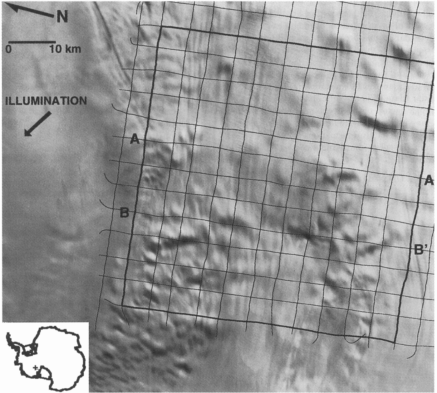 Fig.2. Landsat TM image of study area with airborne .flight lines superimposed. Heavy lines indicate the box over which the photoclinometric method was applied. The inset shows geographic position of area on Ice Stream C.Profiles A-A' and B-B' are shown in Figure 8.
