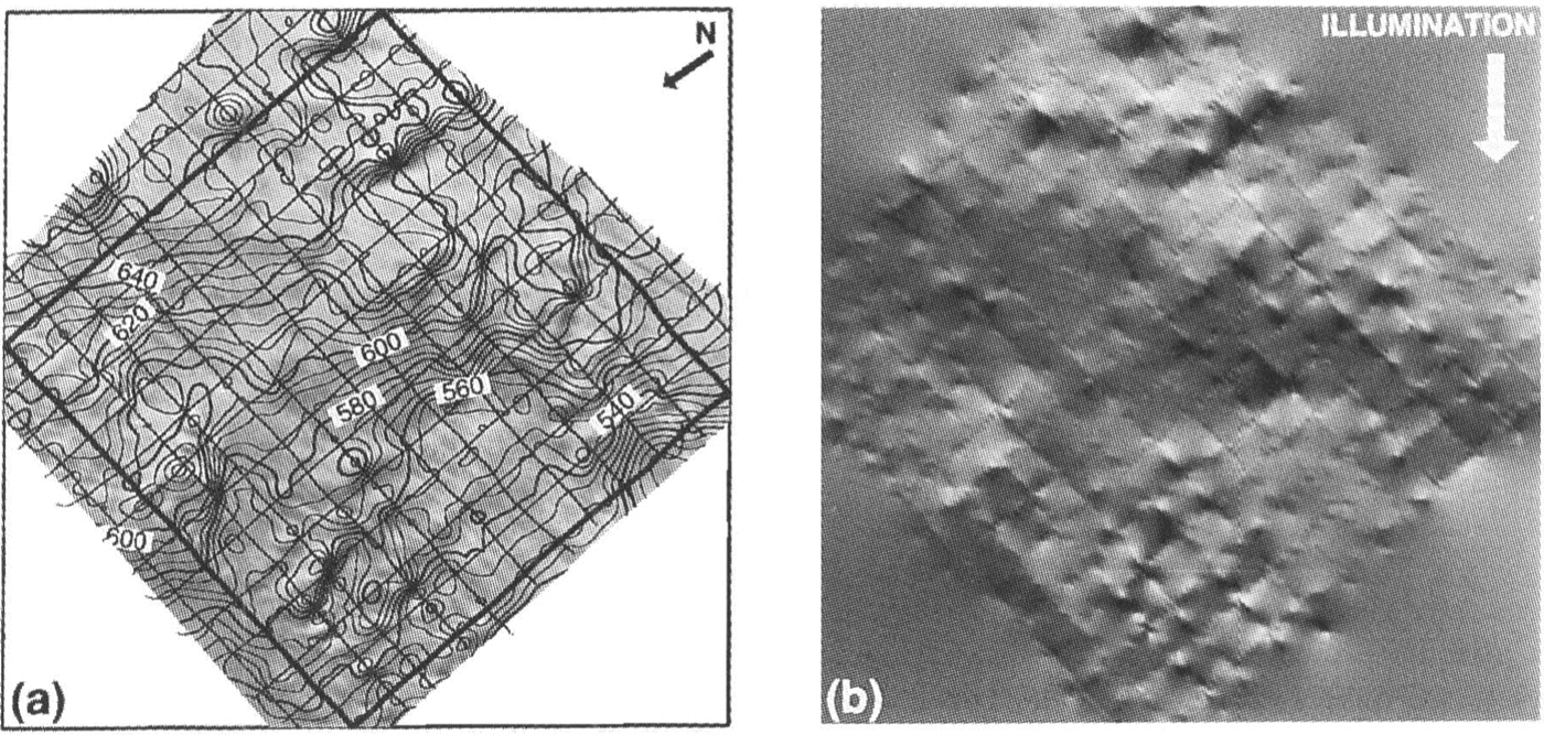 Fig.3a. r.Elevation-contour map based on airborne-radar data only. Contour interval is 5m. Contours are superimposed on original image. b. Shaded relief version of contours in (a) illuminatedfrom the direction indicated. This illumination direction corresponds to the direction in the original image. These images, and those of Figures.5,Figures.6 and Figures.9 are displayed in the Sun-aligned coordinate system described in the text.