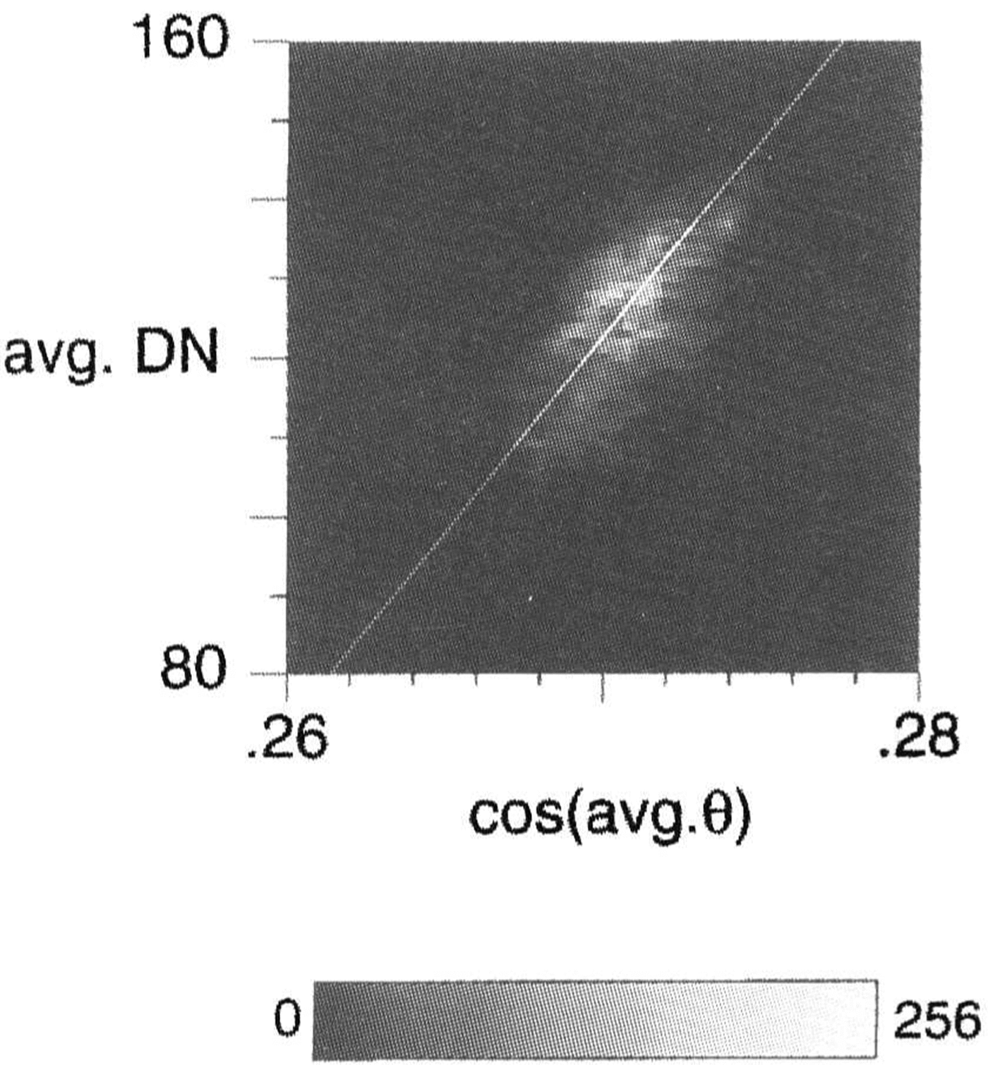 An alternative, empirical approach to determining A and B is to use the field data to find a bestfit for Equation11) The image data were divided into short segments each beginning and ending at a radar flight line. Any pixel belongfd to only one such segment. Each segment was characterized by the mean slope between end points calculated from the radar data and the average DN value for all pixels on the segment. Because of the ± 3.7m standard error in radar elevations, the error in surface slope varies inversely with the segment length and is equal to ±0.18/N where N is the length of the segment in pixels. Segments shorter than 75 pixels (2137.5m) were omitted, leaving 29471 pairs of slope (expressed as the cosine of the average illumination angle) and average DN'. Figures. 4 presents this distribution as an intensity histogram. The spread of this distribution in the cosɵ dimension is approximately 0.0025, consistent with the 75 pixel cut-off in profile length (N = 75 corresponds to a surface-slope error of ±0.0024 rad).