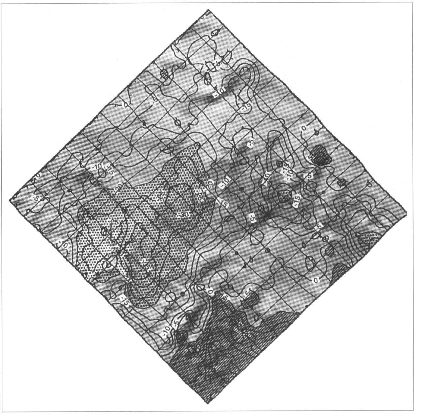Fig. 6. Contour plot of elevation residual (radar minus photodinometric).Shaded areas are less than -20 m and greater than 5 m approximater 1σ limits from the mean residual value.
