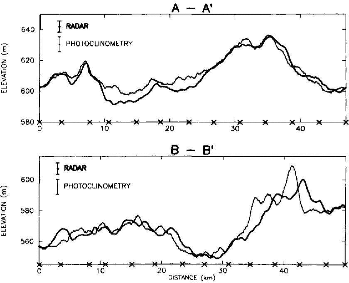 While it is useful to study the overall pattern of difference between the radar and photoclinometric DEMs as was shown in Figure 6, it also is valuable to look at how specific elevation profiles compare. Figure 8 shows two elevation profiles along flight lines indicated in Figure 2. The photodinometric profiles were calculated using an integration distance of 12km - thus, they were controlled 6km upstream and 6km down-Sun. Profile A-A' shows very good agreement. The disagreement is worst in the middle section where the radar-derived elevations lie beneath the photoclinometric elevations but the majority of the differences are well within one standard deviation of the errors. Profile B-B' illustrates a different sort of difference which strongly suggests a 2km horizontal error in the co-registration of the radar and image data. Co-registration accuracy is discussed in the next section.