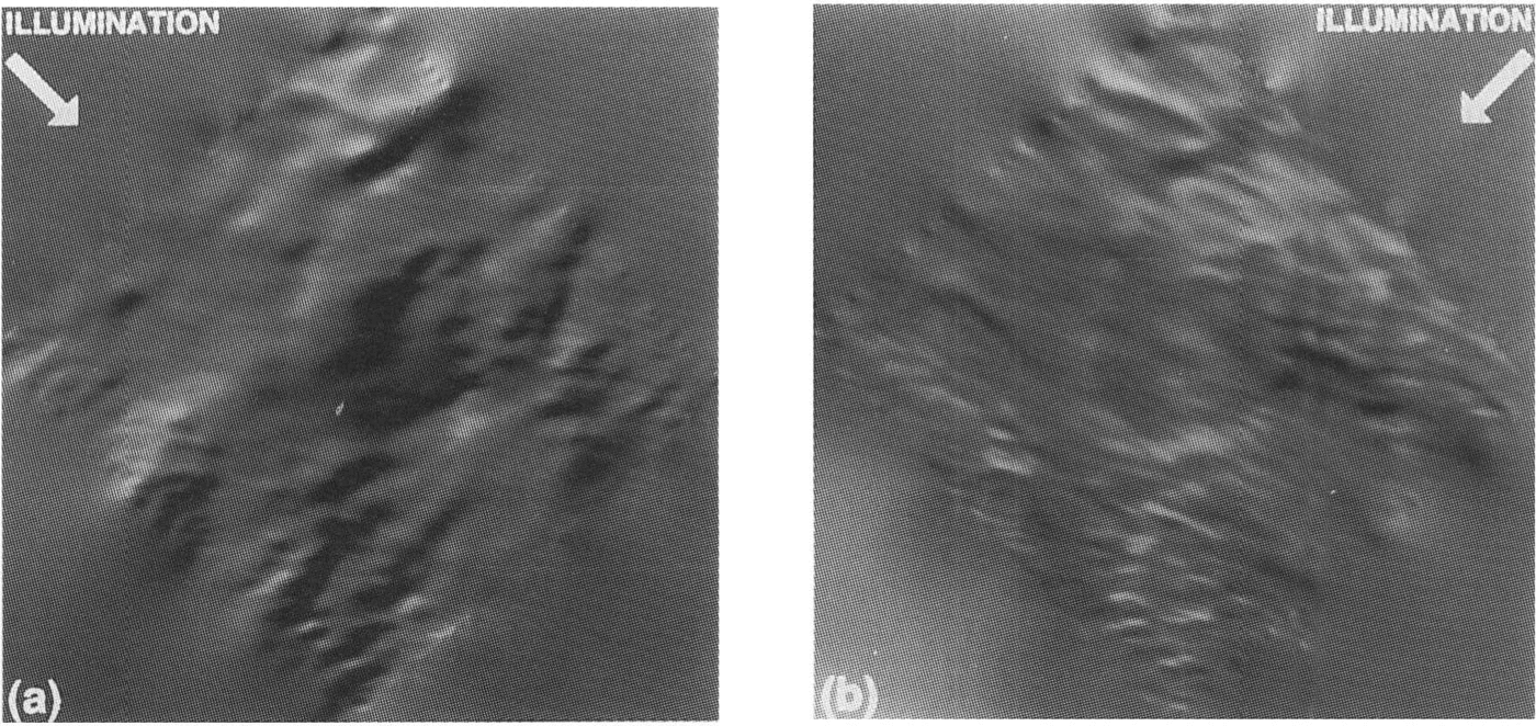 Fig. 9. Shaded relief images of the pllOtoclinometric elevation field illuminated (a) along:/low and (b) cross-flow, as indicated.