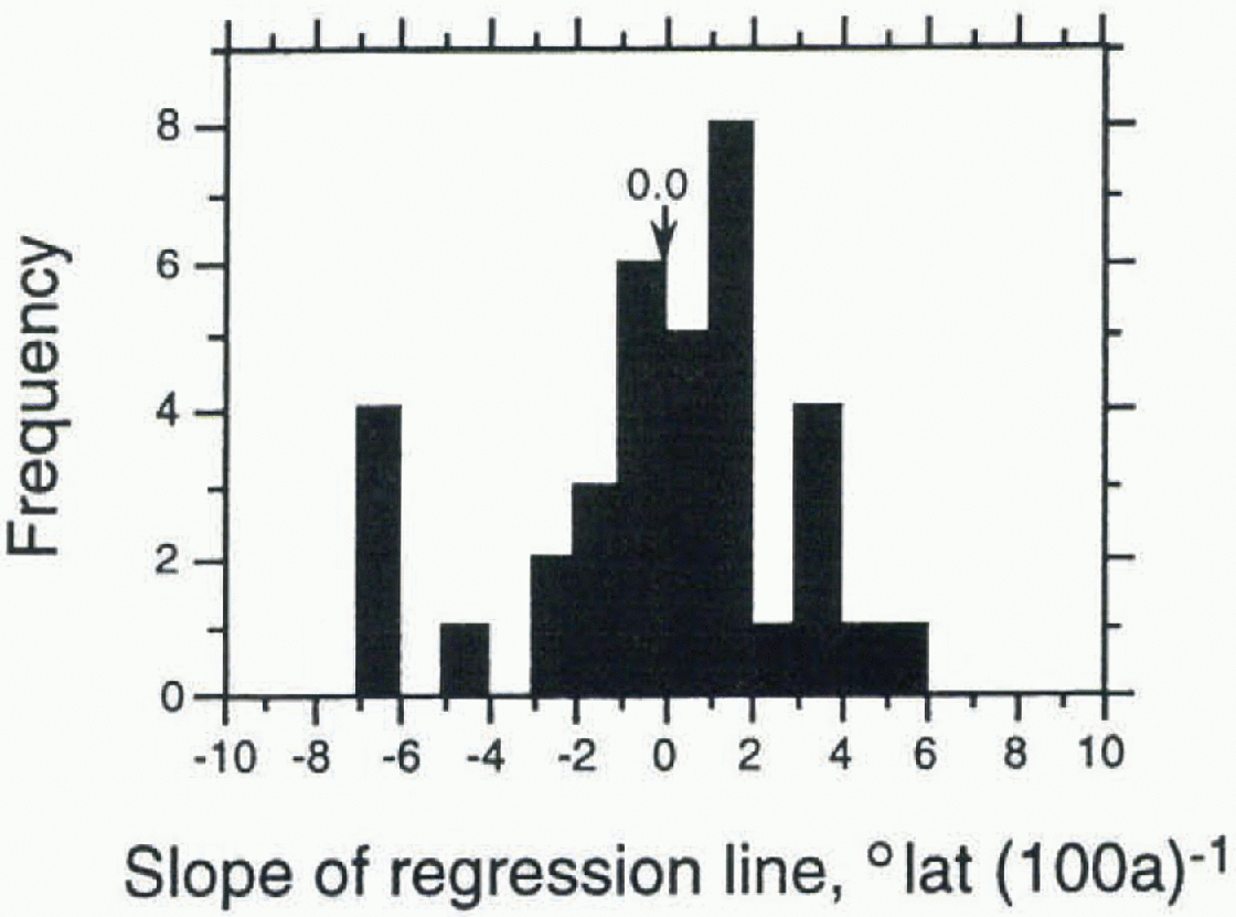 Figure 3 shows a histogram of the frequencies of longitudes (based on a total of 36 longitudes at 10° intervals) with mean annual sca-ice-extent data exhibiting different regression-line slopes. These data are from the U.S. Navy-National Oceanic and Atmospheric Administration Joint Ice Center (JIG) weekly ice charts (one map is chosen per month) and cover the period 1973-96. There is a wide distribution (from -6° to 4-4 lat. (100 a)−1) of trends of sea-ice change, but the mean trend over this period is near zero. As noted below, the four 10° longitude locations exhibiting high negative slopes (i.e increased sea-ice extent) are from one sector, while the six with high positive slopes (i.e decreased sea-ice extent) are from another. Apart from these two sectors of clear advance and retreat, the sea-ice-extent trends over the satellite era are small.