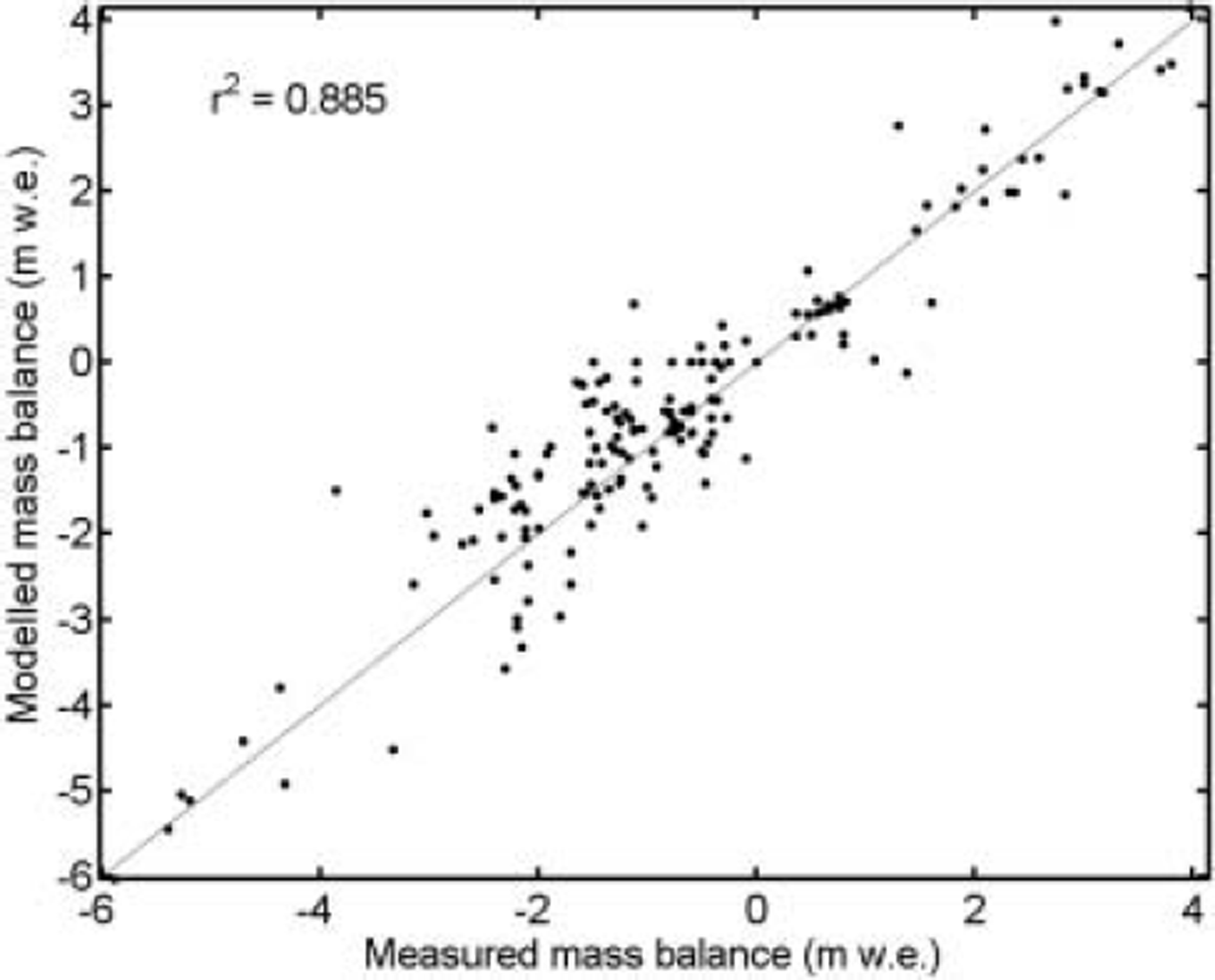 Fig. 3. Scatter plot of measured vs calculated mass balance at individual stakes. The number of samples is 174.