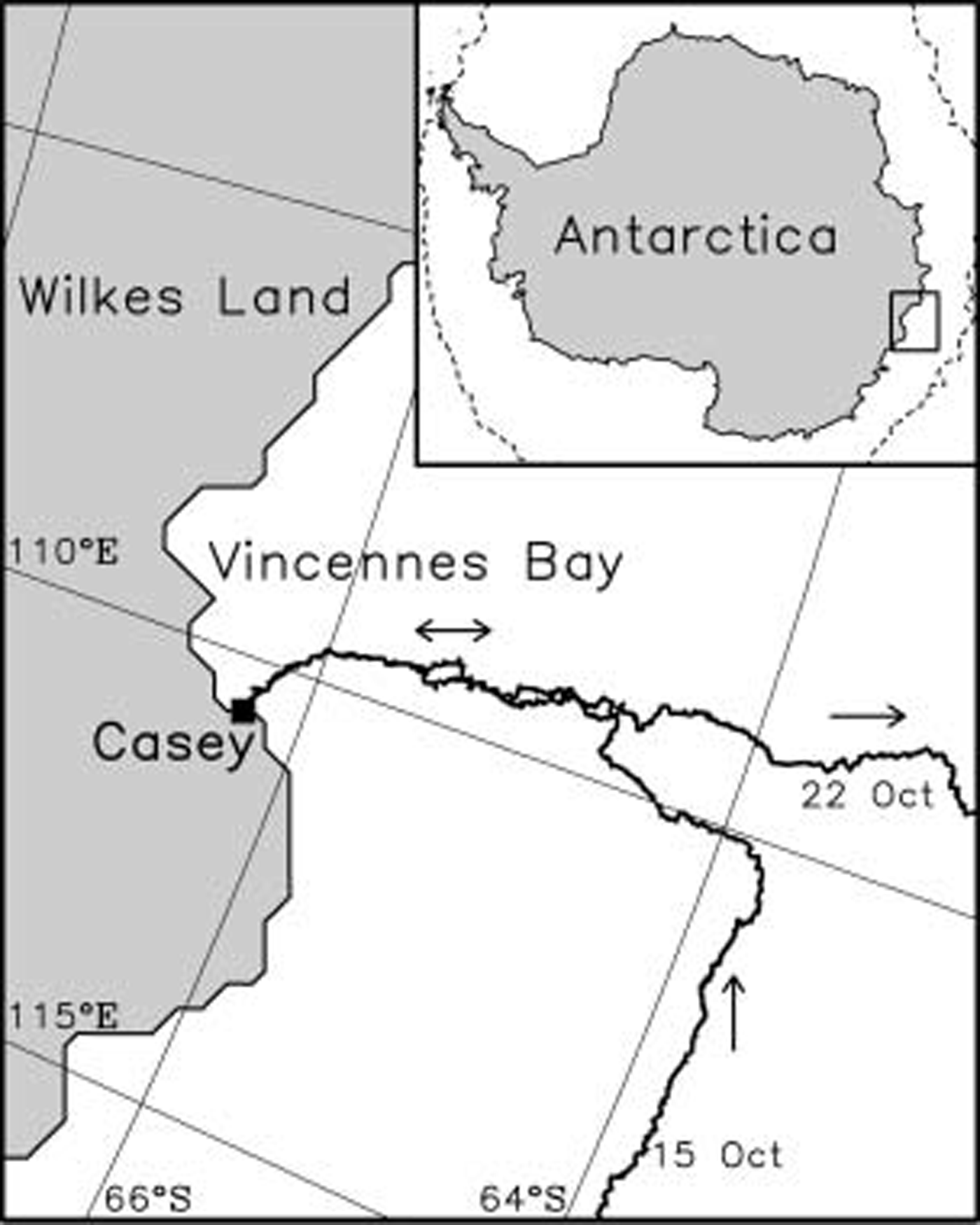 Fig. 1. Map of the Vincennes Bay region of East Antarctica Showing the cruise track of the R/V Aurora Australis during the 2003 ARIsE experiment. The Study region is demarcated by the box in the inset map of Antarctica. The dashed line in the inset denotes the location of the Sea-ice edge, derived from Special Sensor Microwave/Imager (SSM/I/I) ice-concentration data on 19 October 2003, at the time of the experiment.