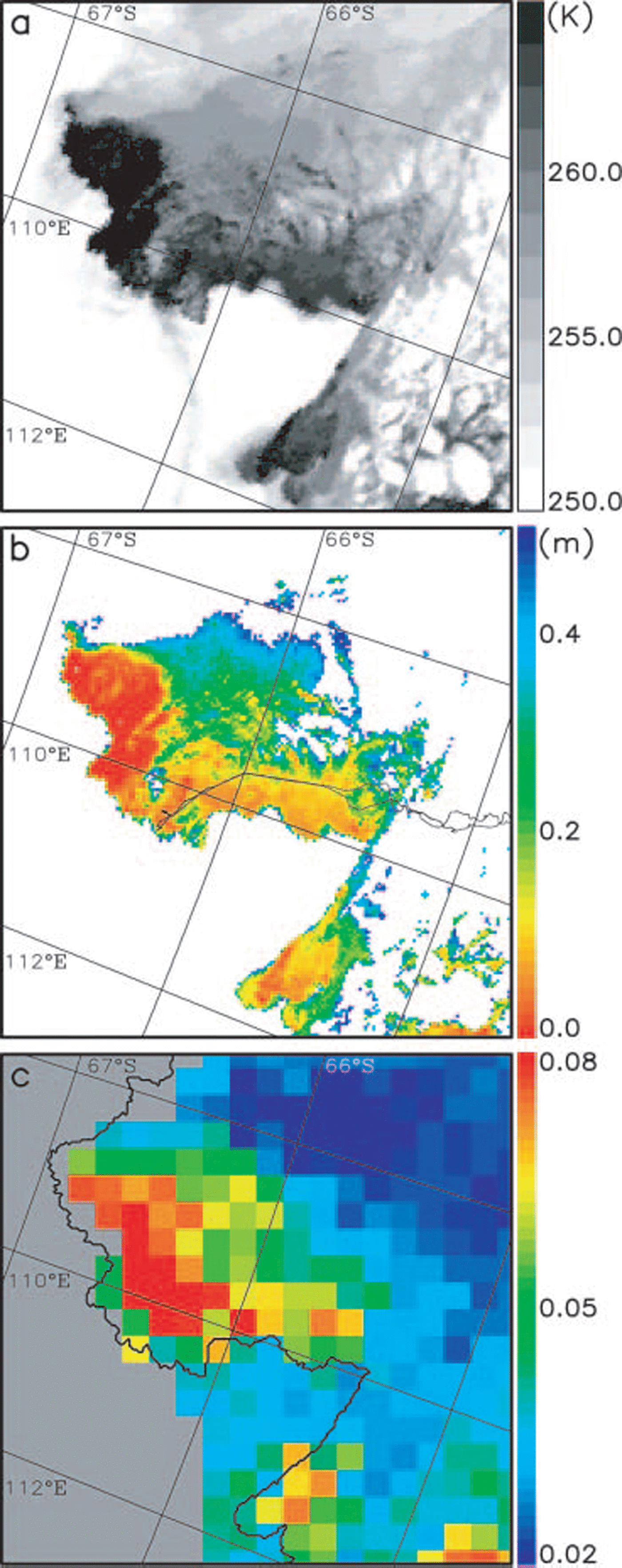 figure 2a and b Show examples of the Spatial distribution of the avhrr Surface temperature and avhrr ice thickness around vincennes bay (for 19 october 2003). the thin-ice distribution is dominated by the presence of a well-developed polynya, with a gradation of increasing ice thickness with increasing distance away from the coast as expected. the meteorological conditions at this time were cold (air temperature ∽257 k), calm (wind Speed ∽5ms–1) and cloud-free. for the Same geographic region, figure 2c Shows the SSM/I/I pr values at 85 ghz (pr85), which are discussed further below.