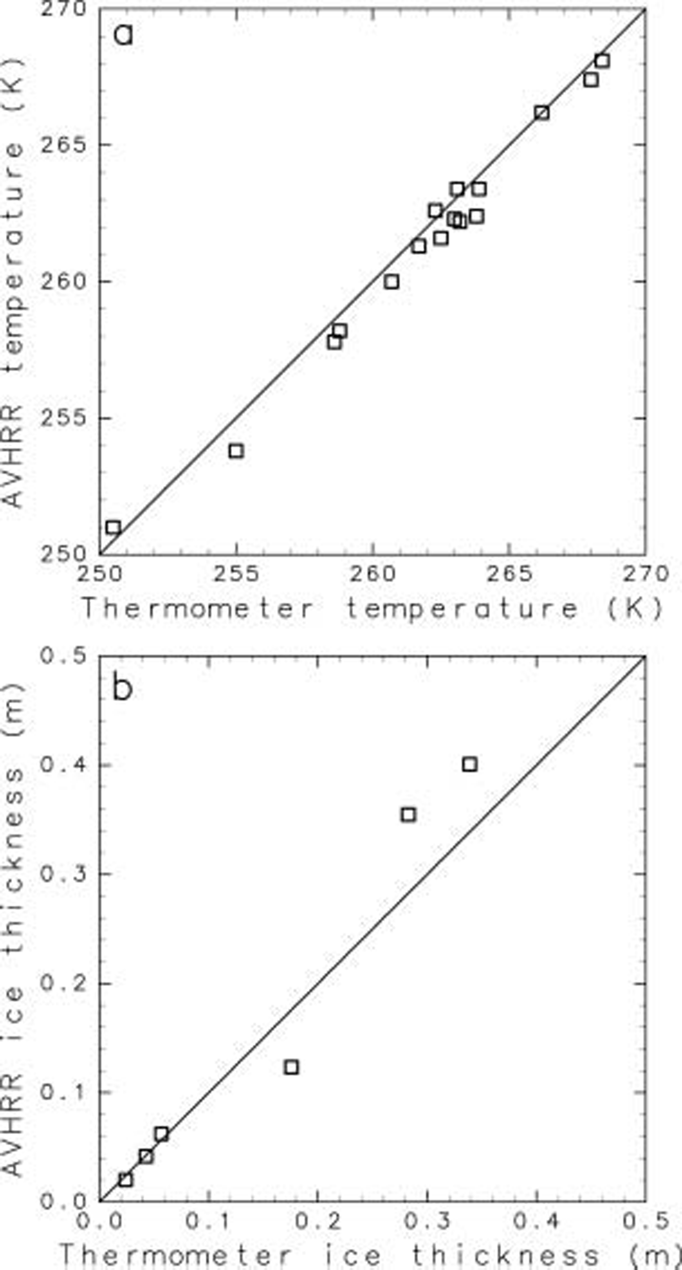 Fig. 3. Scatter plots of (a) the AVHRR temperature vs thermometer temperature; and (b) the AVHRR ice thickness vs the thermometer ice thickness.