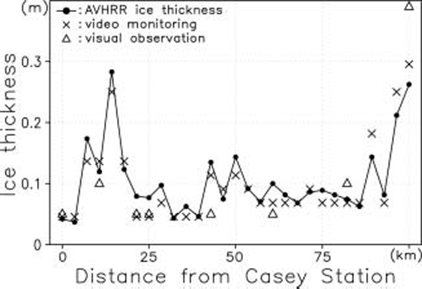 Another comparison, which is more reliable, is carried out on data acquired along the cruise track during the daytime of 19 october (fig. 5), when the vessel left casey Station and traversed the vincennes bay polynya in a northward direction (fig. 1). once again, all ice thicknesses except the avhrr ice thickness Show values at the time of the Ship position of the abscissa. the avhrr thickness is derived from avhrr data at 0529 h (local time) on 19 october, again using the thickness from a pixel nearest to the Ship position corresponding to the abscissa. local time at 0 and 100 km in figure 5 corresponds to 0600 and 1400 h, respectively. because the average net heat flux in this polynya from 0600 to 1400 h on this day is ∽–20wm–2, the corresponding change in ice thickness due to the Sea-ice growth or decay is very Small, i.e. of the order of 0.001 m. thus, the avhrr ice thickness at 0529 h can be applied to all data in this figure without any correction. the bias of the avhrr ice thicknesses minus the ice thicknesses estimated from video monitoring is +0.005 m, and the Standard deviation of the difference between the two is 0.022 m. also, the avhrr ice-thickness estimates are comparable with those from the hourly visual observation dataset.