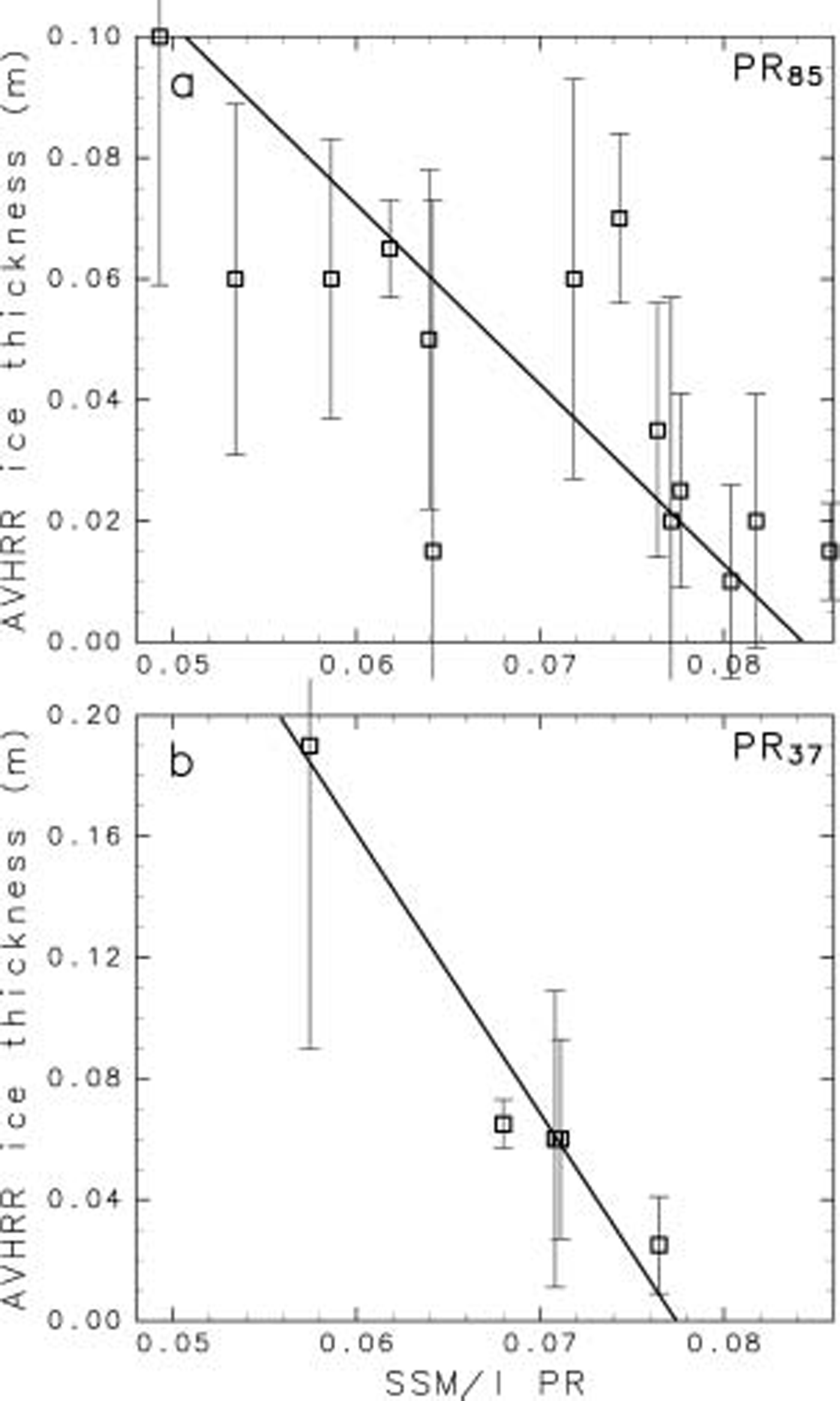 Fig. 6. Scatter plot of the AVHRR ice thickness vs SSM/I/I PR for (a) 85 GHZ and (b) 37 GHZ. The Solid line denotes the principal-component axis of these plots. The vertical lines with crossbars Show the Standard deviation of AVHRR ice thicknesses in the SSM/I/I gridcell in each plot.