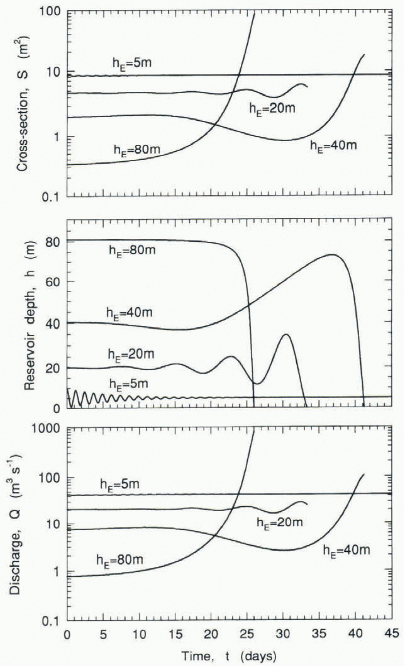 Fig. 3. Time evolution of the conduit cross-section, reservoir depth and discharge through the conduit for four values of the equilibrium reservoir depth. 5, 20, 40 and 80 m. The system is perturbed from equilibrium by increasing the initial reservoir depth by 1% (except for the 5 m case where the initial depth is increased by 100%). The fixed parameters are: sin α = 0.1, A = 100hE2, lE = 10 km and zE = 400 m.