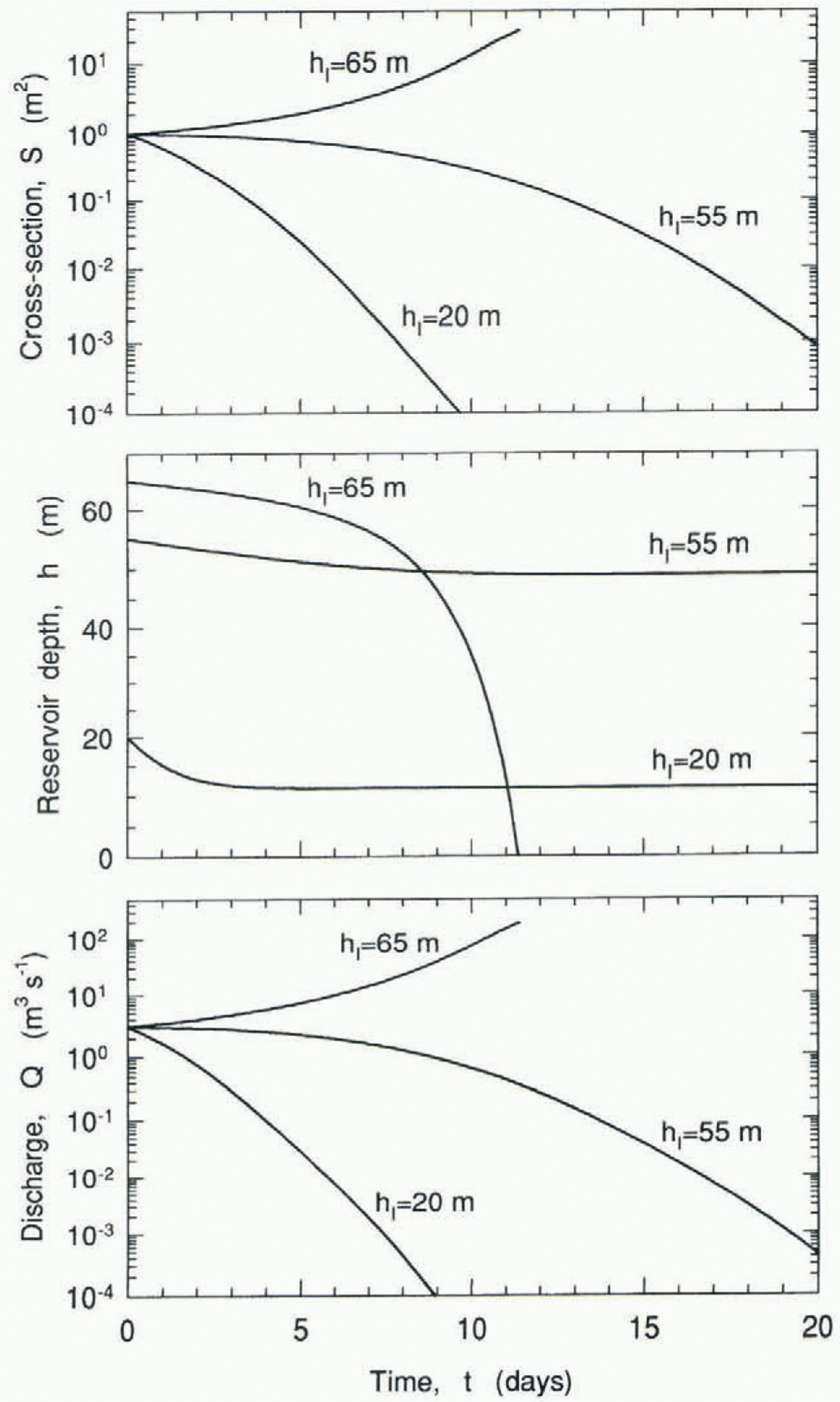 Fig. 5. Time evolution of the conduit cross-section, reservoir depth and discharge through the conduit for three initial values of the reservoir depth, 20, 55 and 65 m. For all three cases, the initial conduit cross-section is SI = 1 m2, there is no inflow to the reservoir, QIN = 0, and sin α = 0.1, A = 100 hI2, l=10 km, z = 400 m.