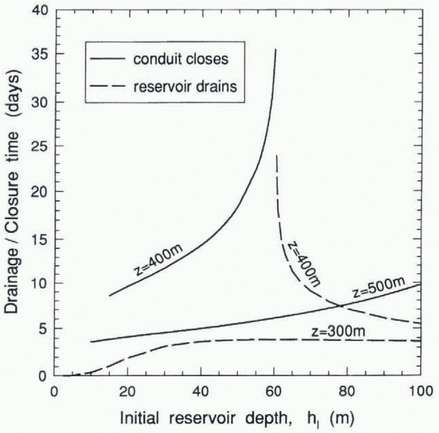 Fig. 6. Time required for the reservoir to drain, or for the conduit cross-section to decrease from 1 m2 to 10– m2, as a function of the initial reservoir depth, for three values of the glacier thickness, 300, 400 and 500 m. There is no inflow to the reservoir, QIN = 0, and sin α = 0.1, A = 100 hI2, l = 10 km.