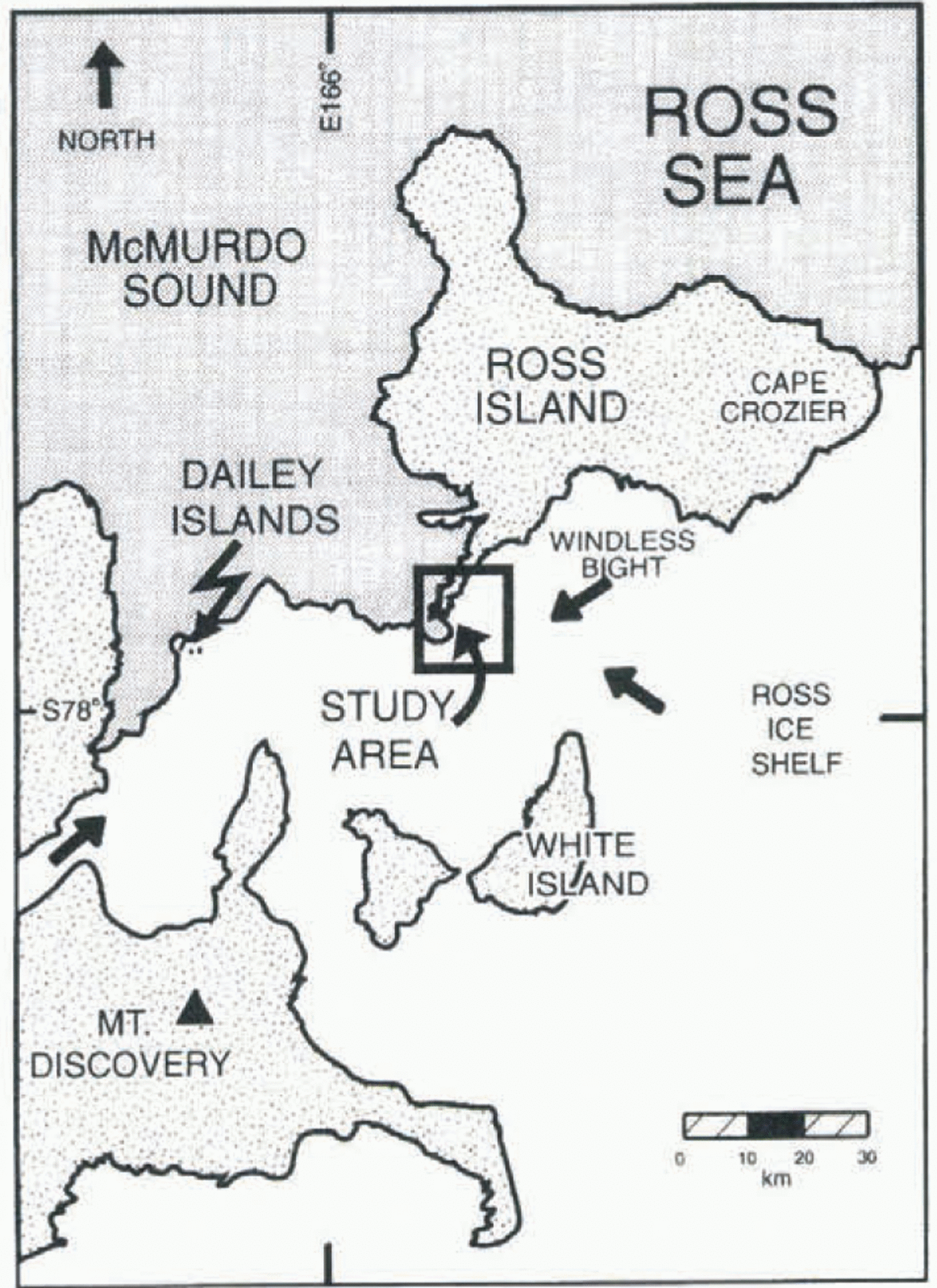 The line bends westward at about (easting, northing) = (6000, –3000) m (Fig. 3), and becomes less smooth (Fig. 1). We speculate that ice to the south is less permeable to brine infiltration. A difference in the origin of this ice is indicated by measurements of ice velocity on McMurdo Ice Shelf by repeat satellite imagery (Whillans and Merry, 1996) that show that ice to the south derives from Ross Ice Shelf. Ice of the northern part of the studied region derives locally, from Ross Island. We speculate that ice from the two different origins has different depths to the firn-to-ice transition. Perhaps this is a result of larger accumulation rate in Windless Bight through which the Ross Island ice travels or of larger strains in ice from Ross Ice Shelf associated with its passage into McMurdo Ice Shelf. We suggest that this contrast in ice history makes firn densities larger at depth for ice imported from Ross Ice Shelf than for locally formed ice. Hence, brine infiltration is more difficult to the south, and the limit to infiltration bends at the boundary between the ice types.