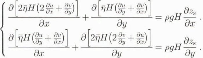 The equations that link the depth-averaged viscosity to the velocities, and which form the basis of the ice-shelf model, are the diagnostic equations of ice-shelf motion (Morland, 1987; MacAyeal, 1989):