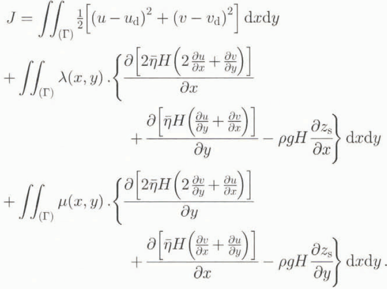 A useful means to minimize J as defined in Equation (1) is to use a Lagrange multiplier vector (MacAyeal, 1993) to incorporate the constraints of Equations (2) into the definition of J as follows: