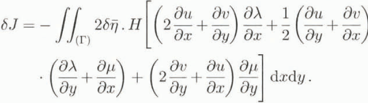 Note that the second and third integrals on the right-hand side are null when u and v are solutions of the forward model. Mathematical manipulation, primarily the use of the Green–Ostrogradski theorem on the null terms, allows us to differentiate J with respect to the free model parameter η, This derivative serves two purposes: its smallness determines when the minimum of J is approached, and it provides useful information for improving previous estimates of η (see next section). The expression for this derivative is obtained from the variation of J with respect to η.