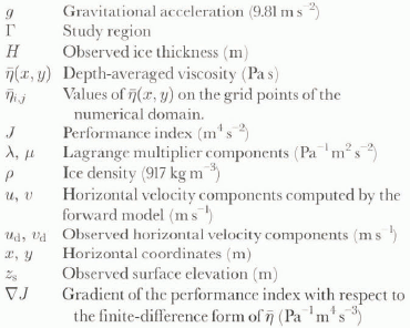 The study domain (Γ) is a 267 000 km2 area of the Ross Ice Shelf. The spatial resolution of the finite-difference grid is 6.822 km, so the numerical domain consists of 5738 active grid points. The performance index J is minimized by selecting the 5738 values ηi,j at the i, jth grid point, using the steepest-descent algorithm described above. The initial