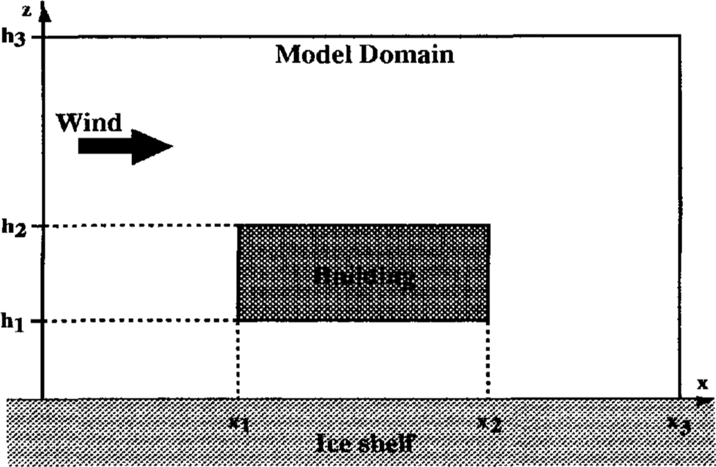 Figure 2 shows the domain in which the model problem is solved. The domain height, h3 , is high enough that there is never any (non-precipitating) snow at this height and the influence of the building on the flow is negligible. The upstream and downstream boundaries are also far enough from the building that its influence on the flow and snow-density fields is not significant.