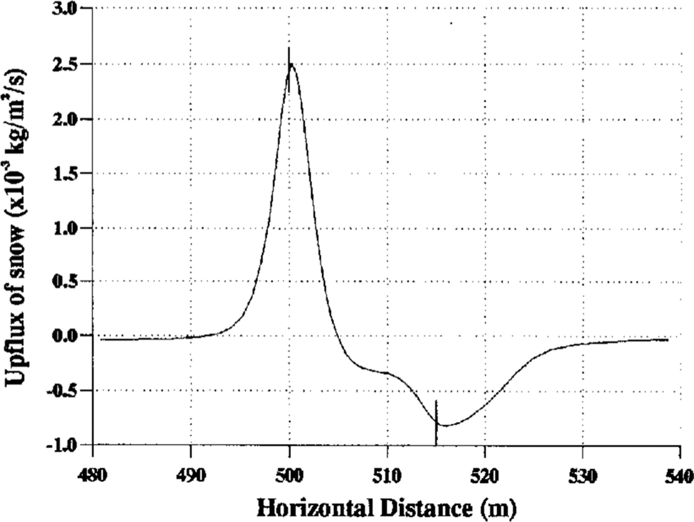 Position of drift peak. The distance of the peak of the downwind drift from the building in the model is only a few metres, whilst in reality it is around 100 m. From progressive (real) profiles, it is clearly seen that, as the drift builds up, its peak moves downwind. The model assumed a flat ground topography, which represents the situation immediately after the buildings were erected. It is hoped that, once the model has been adapted to cope with a partially formed drift as the lower–boundary topography, then subsequent upflux profiles will show progression of the peak downwind. It should also be noted that fill velocities have been calculated assuming spherical particles, and those for very irregular particles can be up to a factor of 2 smaller. This would result in increased lifting and greater downwind transport of snow before the particles settle, hence moving the drift peak downwind.
