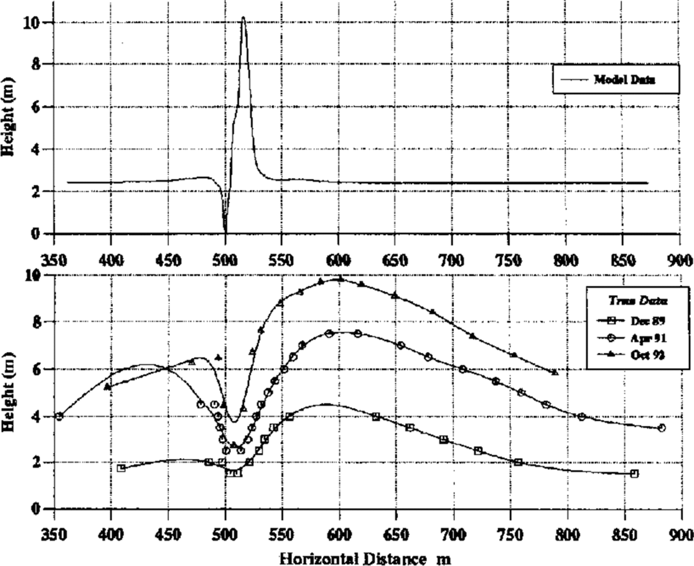 Relative heights of driftsThe ratio of upstream- to downstream-drift heights in the model is around 5%, whilst in reality it is around 50%. This may be due to the fact that, although the prevailing wind is easterly, there is a secondary bias towards winds from the west and, at these times, the whole situation is reversed. It is noted that the relative drift heights are in a similar proportion to the modal frequencies in Figure I.
