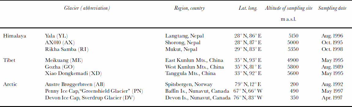 Table 1. The glaciers and sampling sites of the cryoconites