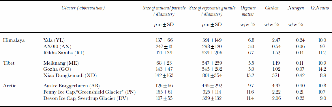Table 2. The characteristics of the cryoconites of the nine glaciers (SD, standard deviation)