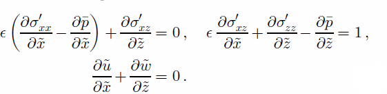and  velocity components, become order unity, and the maximum spatial derivatives in both directions have the same status. With the normalizations (2.4) and (2.5), the momentum and mass-balance equations (2.2) and (2.3) become