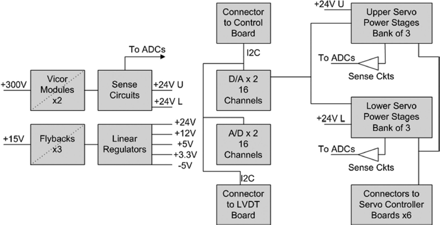 The six power stages were based on a PWM controller of type UHC3525 and an H-bridge of type LMD18200. The H-bridge was supplied in a transistor outline (TO) package and was mounted on the bottom side of the printed-circuit board (PCB) so it could be conduction cooled by the instrument section baseplate. The A/D and D/A interface collected motor currents and voltages as well as voltage and current from the two Vicor modules. The speed and torque set points to the six servo drivers were also channeled through the interface.