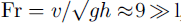 is quite high for the avalanches, indicating a strongly supercritical flow. This shows that no disturbances due to the impact of the flow with the dam are able to propagate upstream against the rapid main flow, and indicates that there is a physical limit to the sideward propagation of disturbances away from the dam into the main avalanche flow. The Froude number may be interpreted as the ratio of the speed of the main flow to the propagation speed of disturbances. Therefore, the ratio of the increase in the width of the Skollahvilft stream, ≈50m, to the length of the stream, ≈450m, may be expected to be similar to 1/Fr =1/9, and these observations of the dimensions of the stream show this to be the case. Such considerations cannot be applied to the Innra-Bagargil stream which channelized the whole width of the avalanche.