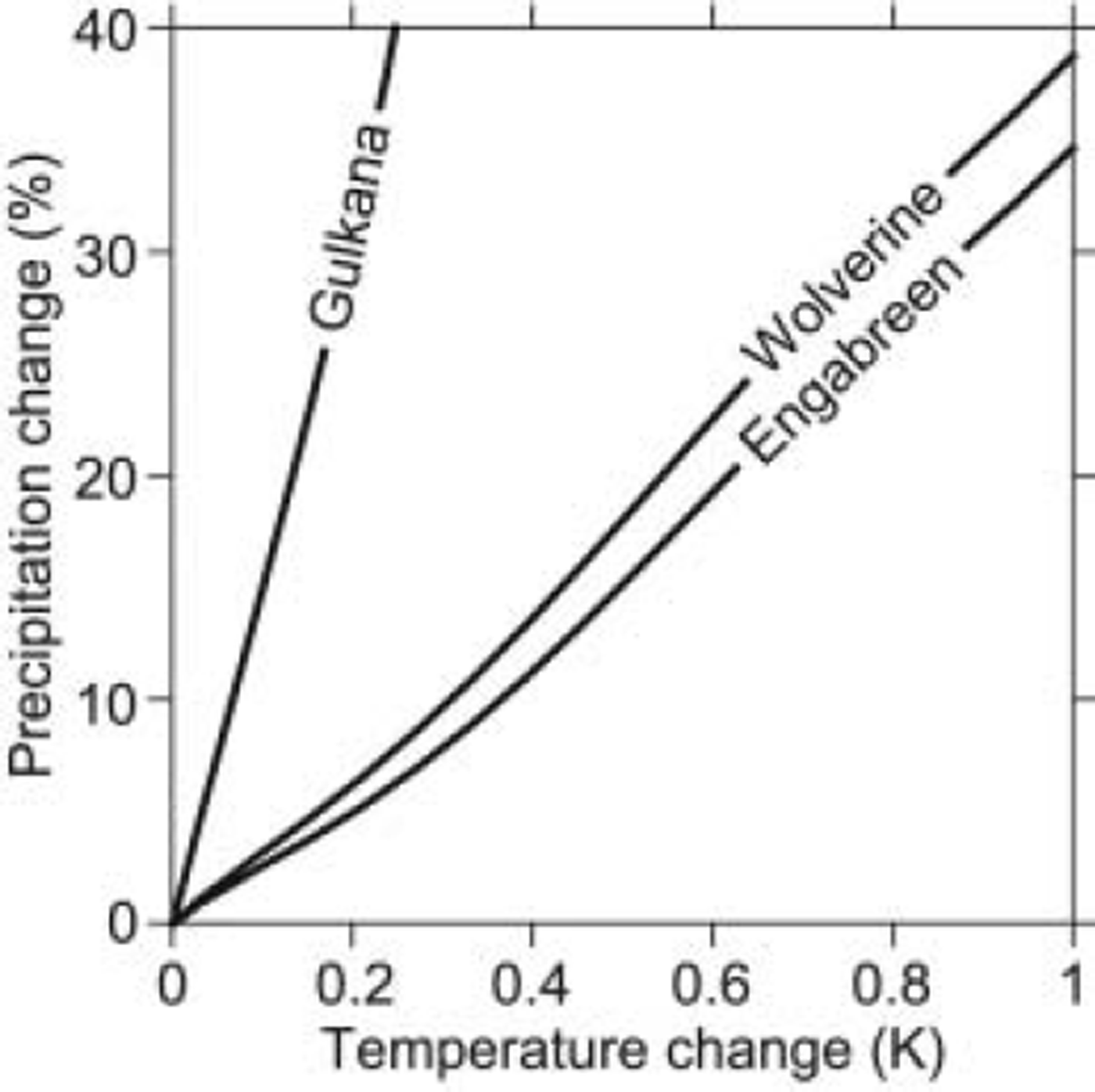 Fig. 5. Zero net mass-balance change (ma-1) as a function of precipitation increase (%) and temperature increase (K) for Gulkana, Alaska, Wolverine, Alaska, and Engabreen, Norway.
