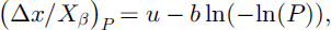 provides a good model for extreme avalanche runout distances. In this model, the runout ratio, Δx/Xβ, is the continuous random variable, u and b are the location and scale parameters, respectively, and P is the non-exceedance probability (threshold probability). A chosen value of P represents the runout ratio for which P 100% of the values in the dataset will not exceed that given value. Equation (3) can be rewritten as