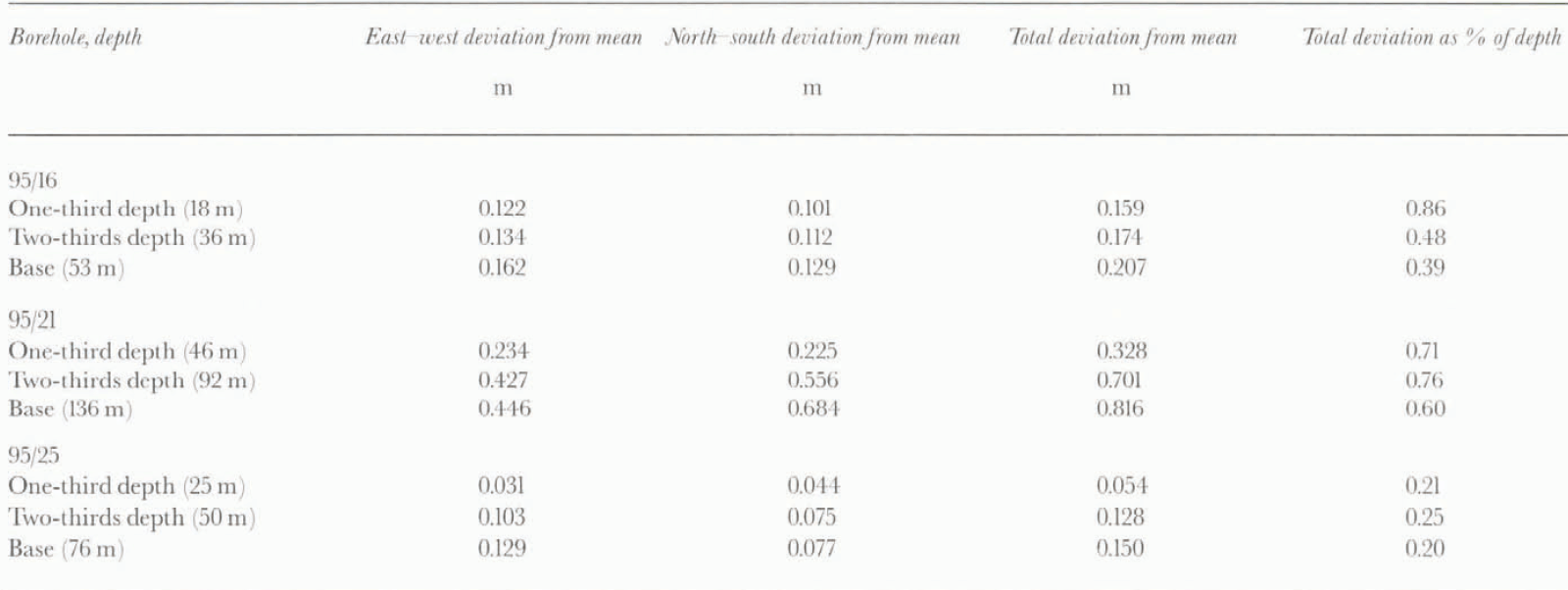 Individual borehole profiles provided information about borehole depth, basal location and longitudinal shape. The boreholes were not straight, but tended to deviate increasingly from vertical with depth. For example, borehole 95/2 was 94 m deep, and the basal location lay 4.9 m to the north, and 10.6 m to the east, of the surface location (Fig. 3a). The longitudinal shape of the boreholes was confirmed by the