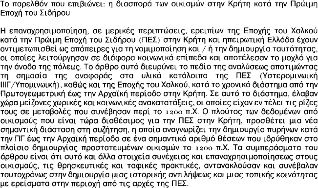 Some re-uses of Bronze Age remains in Early Iron Age Crete and mainland Greece have been identified as attempts at legitimation and/or identity construction which operated at various social levels and were instrumental in the rise of the polis. This paper enlarges the scope of analysis in assessing the meaning of references to material remains of early EIA (Late Minoan III C/SM), as well as Bronze Age, date during the Protogeometric to Archaic periods in Crete. This was a time at which major spatial and social readjustments were taking place, themselves ultimately rooted in transformations occurring c. 1200 BC. The wealth of settlement data now available for EIA Crete adds an important new dimension to the discussion, which recognizes nucleation through PG–A at a significant number of sites established in the 1200 BC defensible settlement movement. The paper's conclusions are that this, and other elements of continuity and reuse in settlement, cult and mortuary practices, both reflected and helped to create a sense of history and of local regionally-based community early in the EIA.